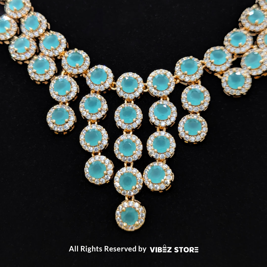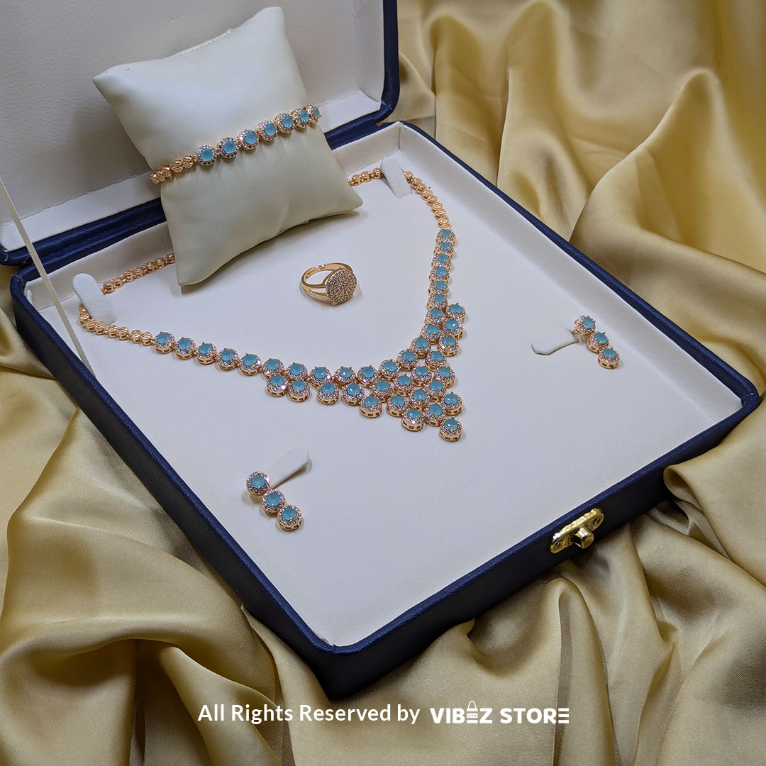 Add a pop of color to your look with this Elegant Aqua Blue Gemstone Jewelry Set from Vibez Store. Featuring delicately crafted aqua blue gemstones set in a luxurious gold-tone finish, this set includes a cascading necklace, elegant earrings, a matching bracelet, and a chic ring. Perfect for weddings, evening parties, or any special occasion, this set exudes sophistication and charm. Lightweight and exquisitely designed, it’s a versatile accessory that complements both traditional and contemporary outfits.