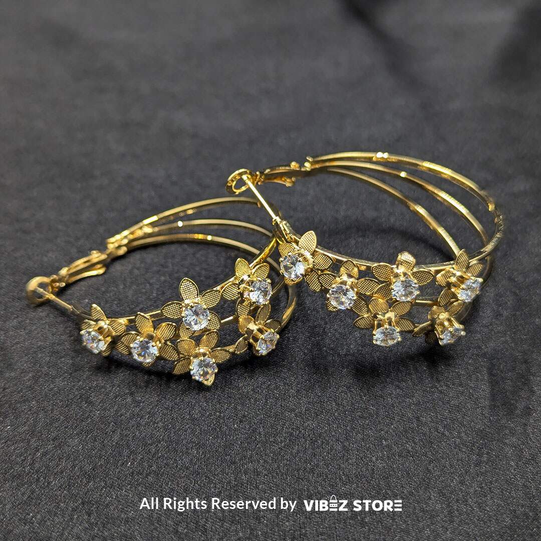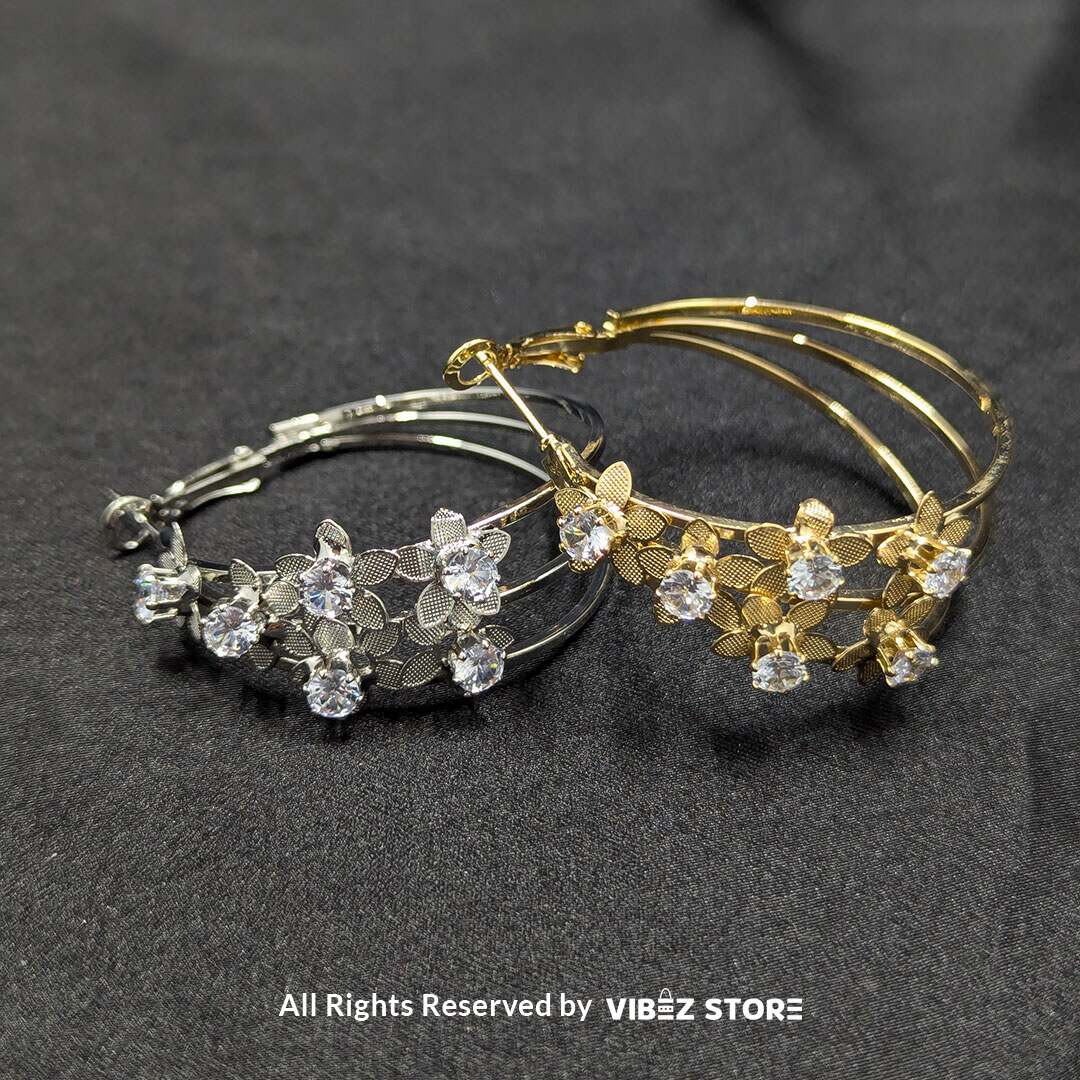 Elegant hoop earrings featuring delicate floral accents with sparkling crystals, available in gold and silver tones.