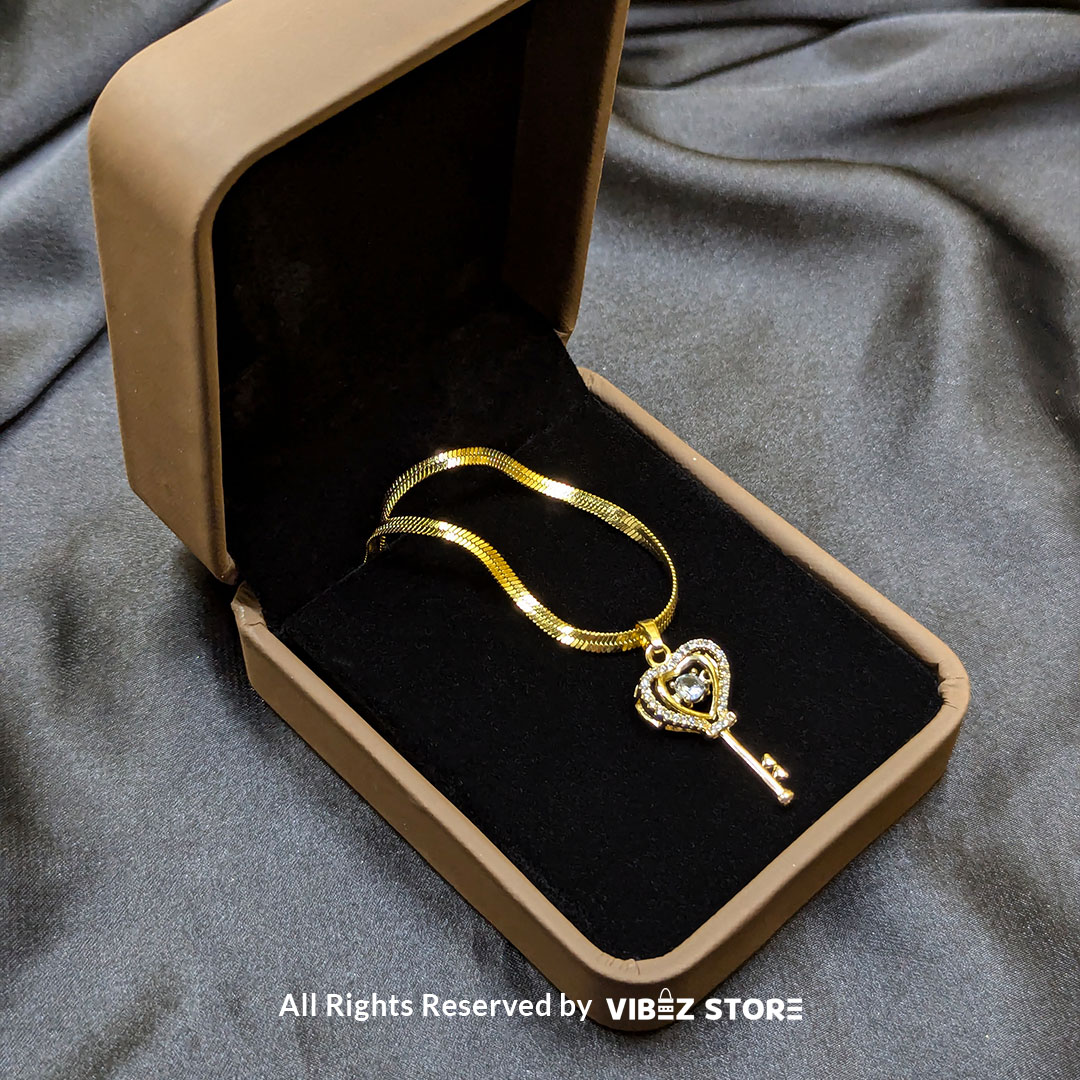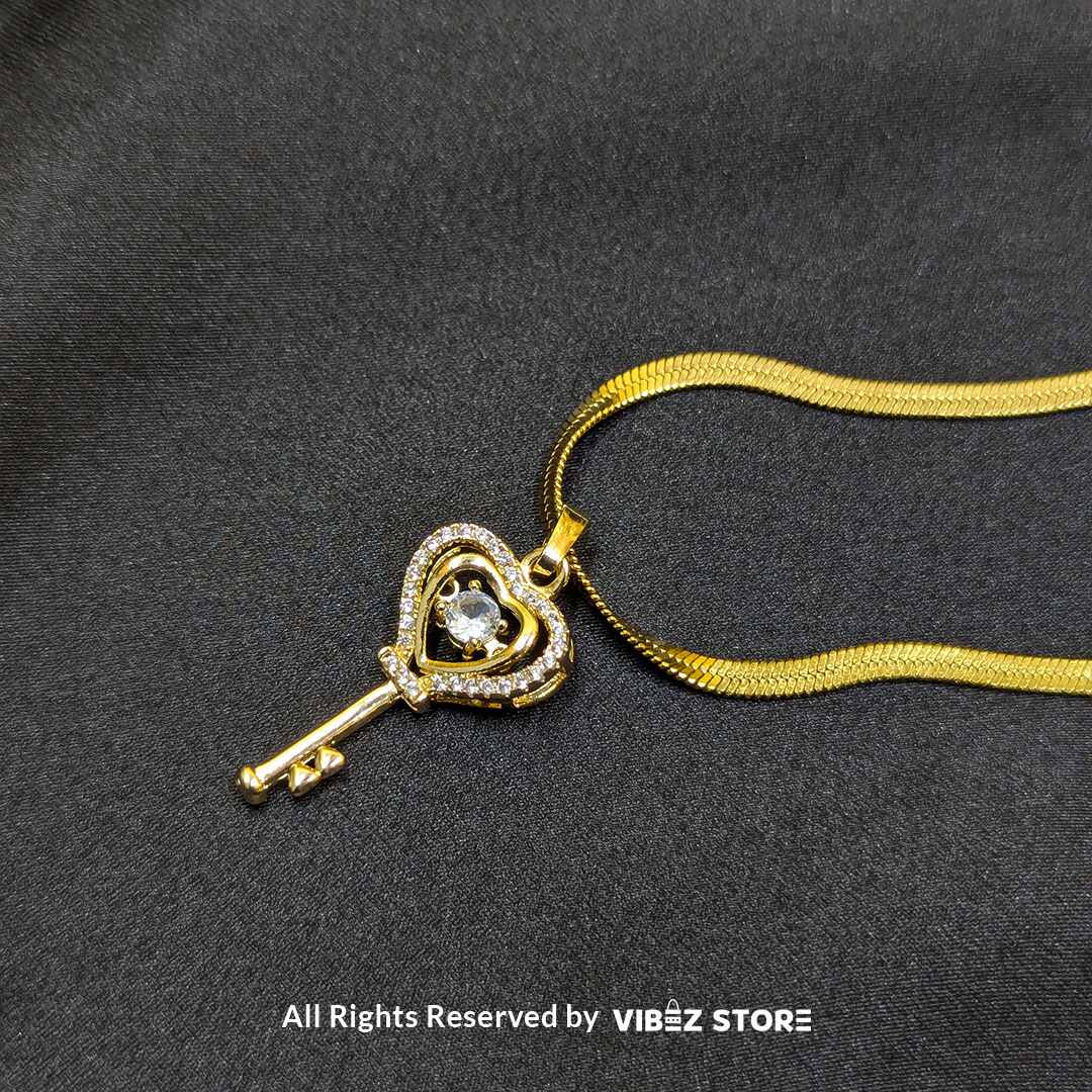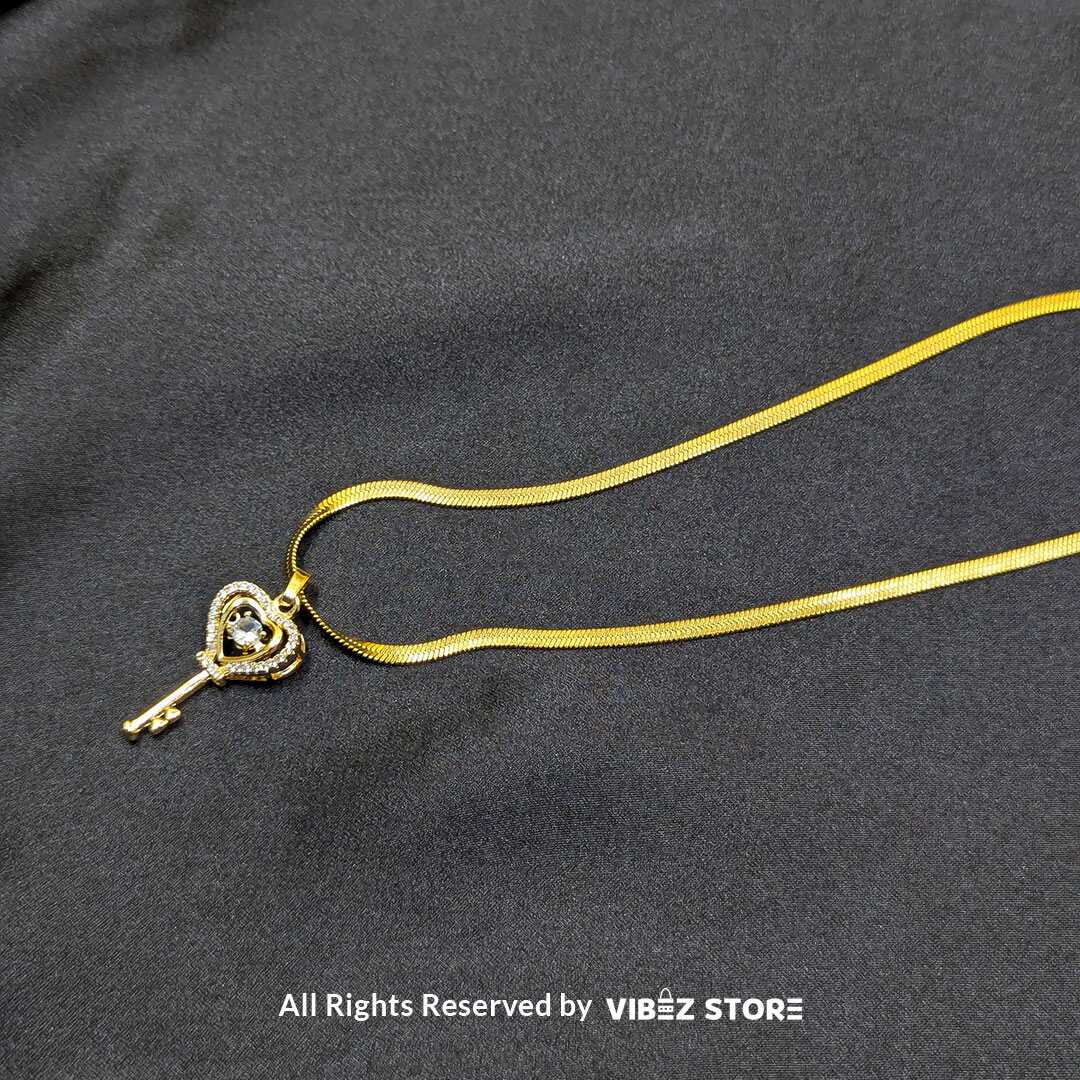 Unlock elegance with this Gold Heart Key Pendant Necklace. This beautifully designed piece showcases a delicate heart-shaped key pendant embellished with a sparkling crystal at the center. Suspended on a sleek gold chain, it adds a touch of sophistication to your style. Perfect for daily wear, parties, or as a symbol of love and trust, this necklace makes an ideal gift for someone special.