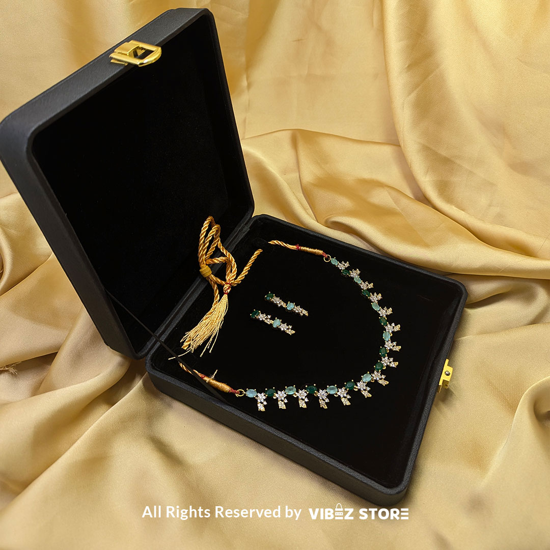 A captivating gold-plated necklace set featuring green gemstones with matching earrings. Perfect for festive celebrations, weddings, and parties.