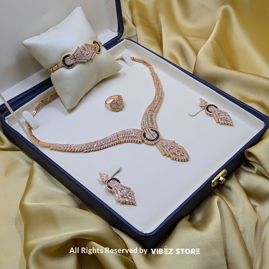 Make a bold and elegant statement with this Luxurious Crystal Wings Jewelry Set from Vibez Store. Designed with intricate crystal detailing in a stunning wing motif, this set exudes glamour and sophistication. It includes a beautifully crafted necklace, matching earrings, a stylish bracelet, and a chic ring, making it perfect for weddings, formal events, or festive celebrations. Lightweight and expertly designed, this jewelry set is a must-have for women who love timeless yet dramatic accessories.