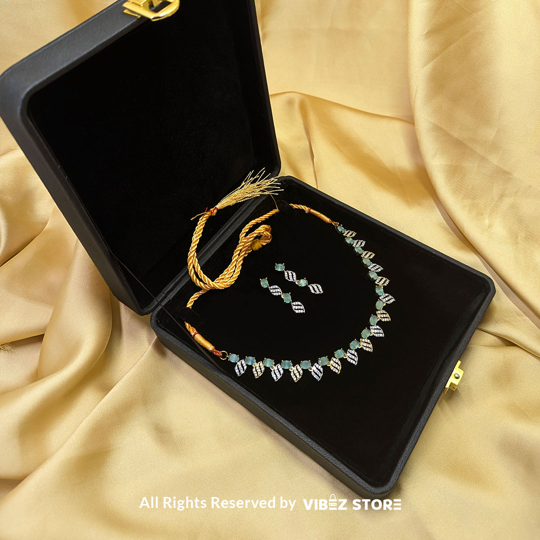 The Mint Green Leaf Necklace & Earring Set is a stunning collection that brings a touch of nature-inspired elegance to any ensemble. This set includes a delicate necklace adorned with soft mint green gemstones set in beautiful leaf-shaped gold-tone frames, complemented by matching earrings that mirror the same graceful design. The intricate craftsmanship and crystal detailing add a subtle sparkle, making this set ideal for special occasions such as weddings, parties, or formal gatherings. Whether you’re dressing up for an elegant evening or looking for a thoughtful gift, this jewelry set combines sophistication and style, offering a refined touch to any outfit.