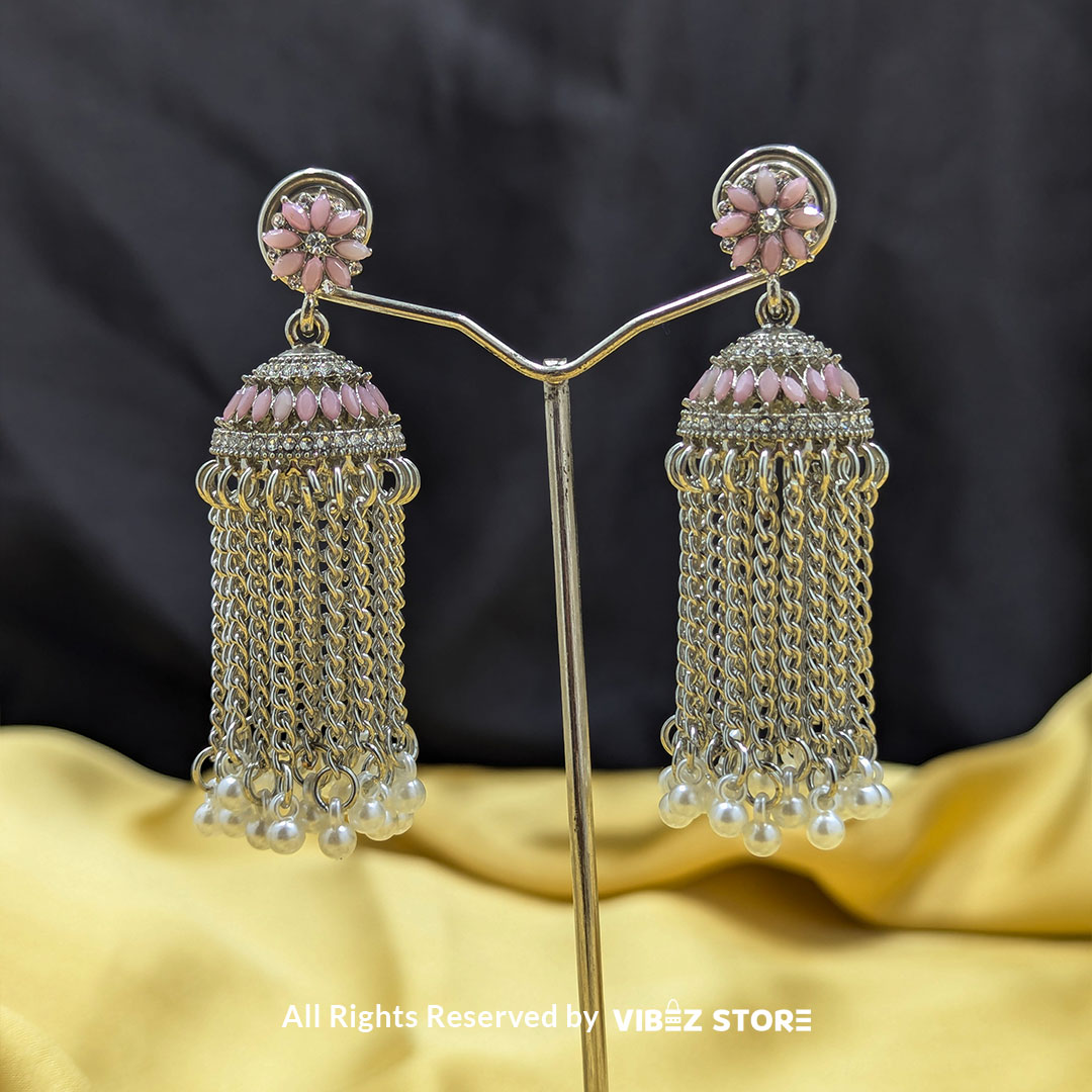 Elegant pink floral tassel earrings featuring intricate floral studs, cascading silver chains, and pearl accents for a modern yet traditional style.
