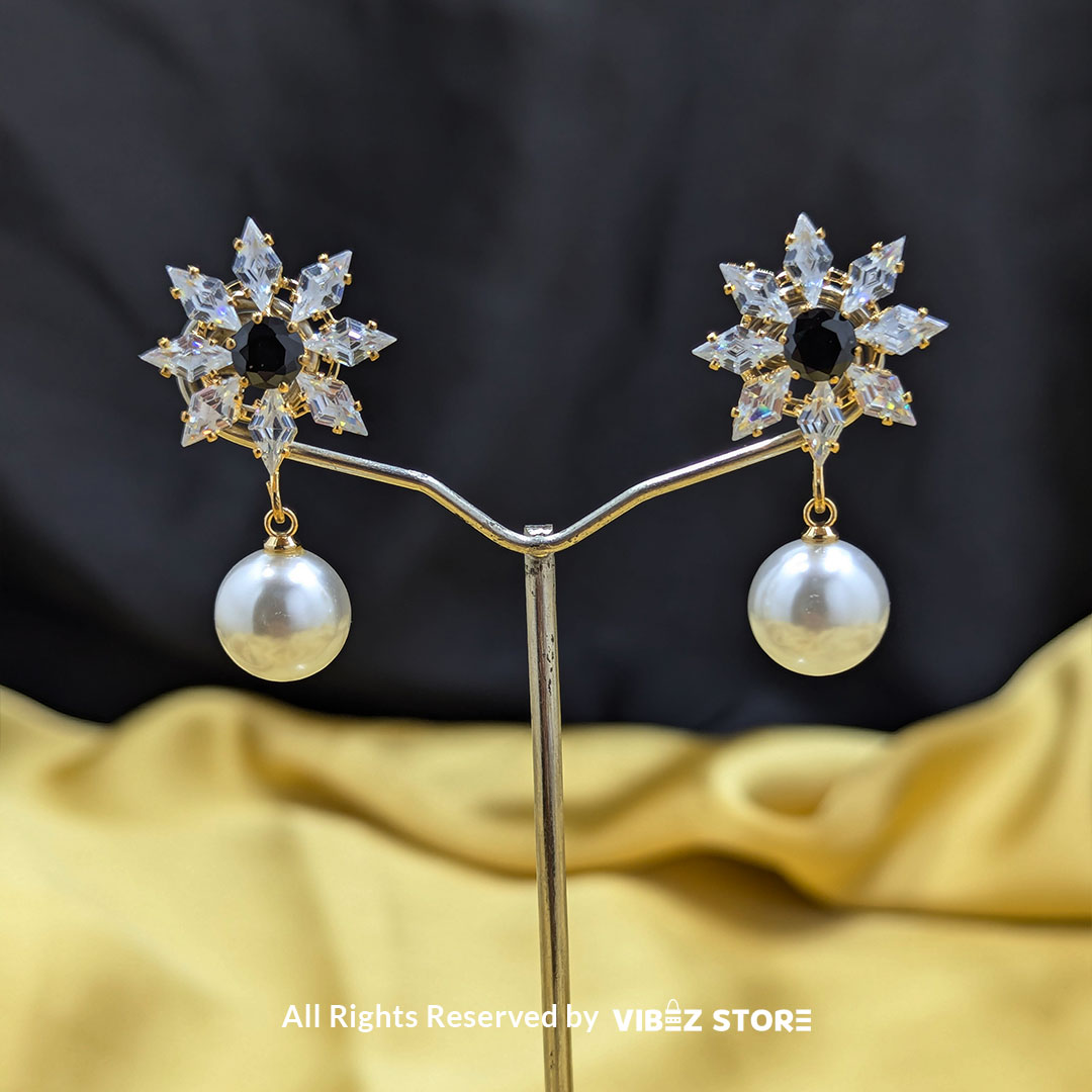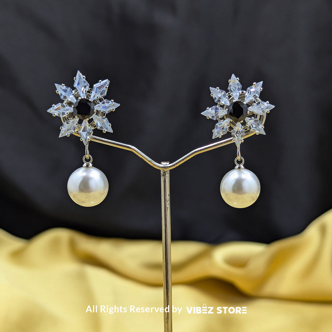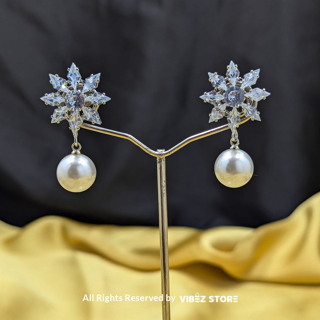 Elegant snowflake-inspired earrings with a lustrous pearl drop, ideal for festive and formal occasions.